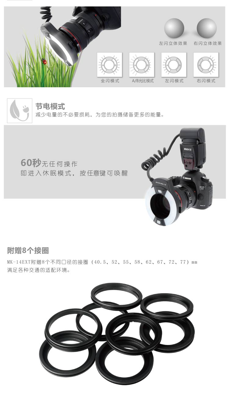 ◆ MK-14EXT-C 是一款環(huán)形閃光燈,主要是用以在微距攝影中補(bǔ)光。亦可用于普通人像拍攝時(shí)補(bǔ)光,最遠(yuǎn)可達(dá)5米優(yōu)秀距離。