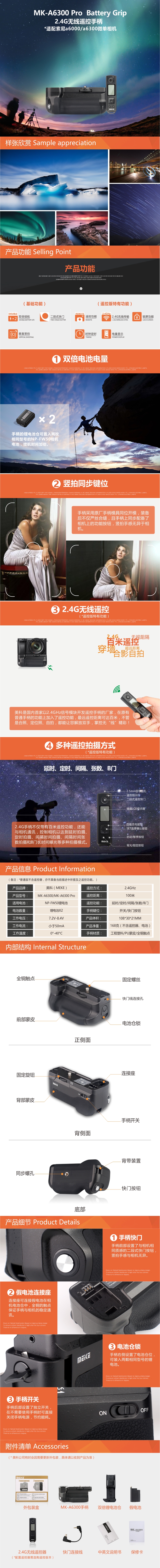 ◆ MK-A6300 Pro除了擁有一般手柄的豎拍功能和雙倍電池續(xù)航外,還可以使用2.4G無線快門遙控器進行遙控拍攝,定時遙控器可設(shè)置延時時間、曝光時間、照片間隔時間以及拍攝張數(shù)。內(nèi)置2.4G模塊,遙控距離可達百米以上,且無方位限制。在拍攝星空、星軌、風(fēng)光、人像等多種場合拍攝創(chuàng)作時非常方便。