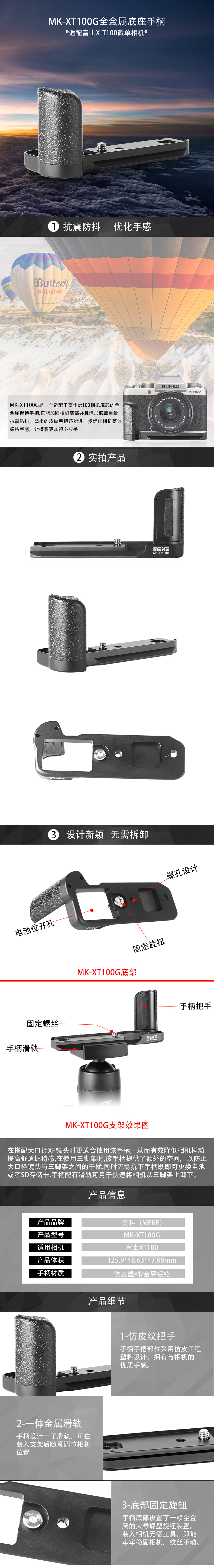◆ MK-XT100G是一個適用于富士XT100相機底部的全金屬底座手柄,它由一整塊金屬制作,能有效抗震防抖,增加相機的握持手感。